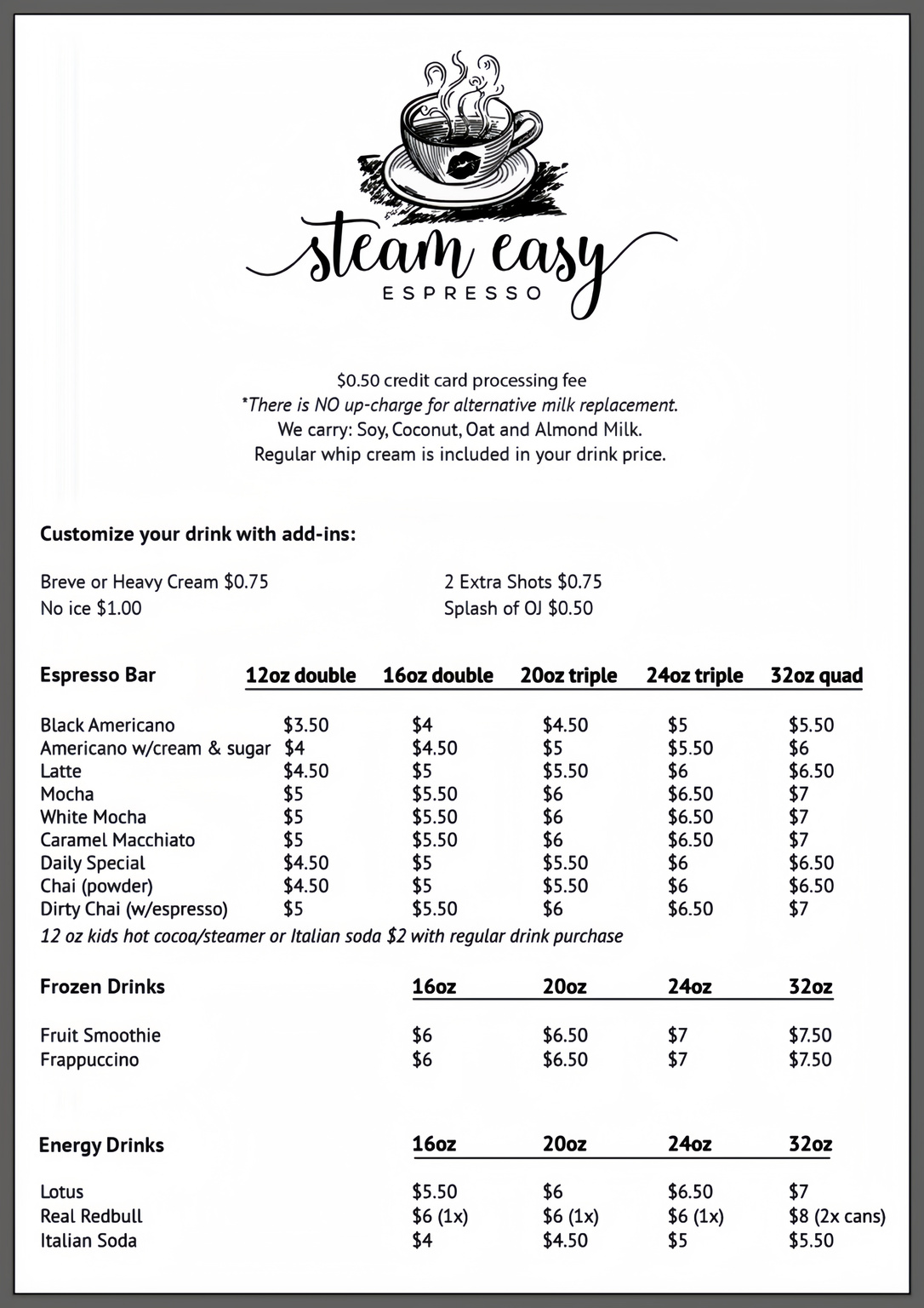 On a whim of opportunity and with the encouragement and physical help of my partner, I took a leap of faith and we renovated the building into an espresso stand. Steam Easy Espresso was established October 5th 2023. Making all my dreams come true, this was not a preplanned endeavor and this opportunity only presented itself to me after significant life changes. With that being said, Steam Easy Espresso was founded on a very modest budget and I knew to make it work I would have to dedicate myself fully everyday. I was very nervous to open a new drive-thru business at a location that did not exist prior. I am incredibly blessed for my amazing regular customers that keep me going and how supportive the Marysville community has been of my small business. I learn something about myself everyday as I chat with each and everyone of you. My customers and my love ones that have supported me truly humble and motivate me. My plans for Steam Easy Espresso is an ongoing work in progress and feedback is greatly appreciated.